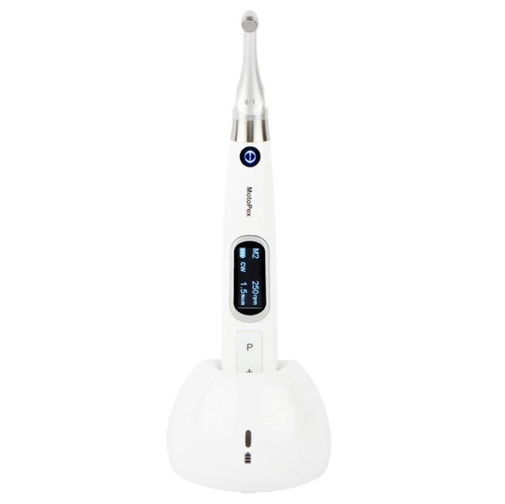 Motopex - это высокопроизводительный бесщеточный беспроводной эндомотор с миниатюрной головкой и встроенным апекслокатором. Плавное вращение и низкий уровень шума сделают лечение более комфортным для пациентов.