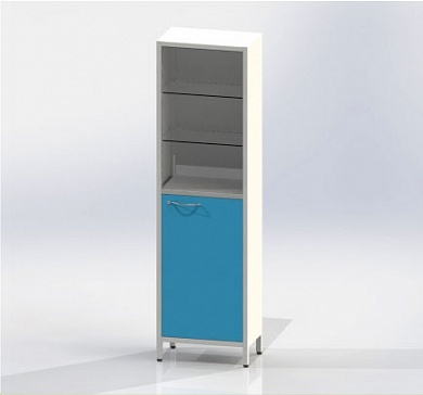 Шкаф одностворчатый на ножках, верхняя  секция с дверцей и двумя полками из стекла, нижняя секция с металлической дверцей с замком и металлической полкой.