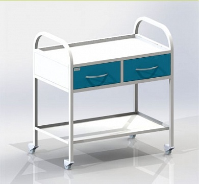 Столик инструментальный передвижной, 2 ящика, одна полка. Колесные опоры диаметром 50 мм, два колеса с тормозом. Высота до рабочей поверхности - 665 мм.