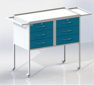 Столик передвижной на колесных опорах диаметром  50 мм,  6 ящиков (два ящика оснащены замками),   столешница из металла с полимерно-порошковым покрытием (с дополнительной выдвижной полкой).