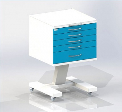 • Подкатная тумба - столик врача с пятью выдвижными ящиками. Колесные опоры на резиновом ходу, две опоры с тормозным устройством.